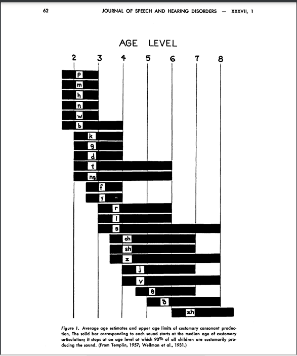 Secondly, Sander didn’t collect his own data. He summarized data from the 1930s, 1950s, and 1960s. That’s right, some of the data were already nearly 50 years old when he wrote this article in 1972. Now, some of these data are nearly 100 years old. Those data happen to be the data on the age of mastery – or the right ends of the bars. In you were wondering, the most recent attempt to determine when speech sounds are learned is now 30 years old (Iowa-Nebraska Norms Project; behind a paywall)