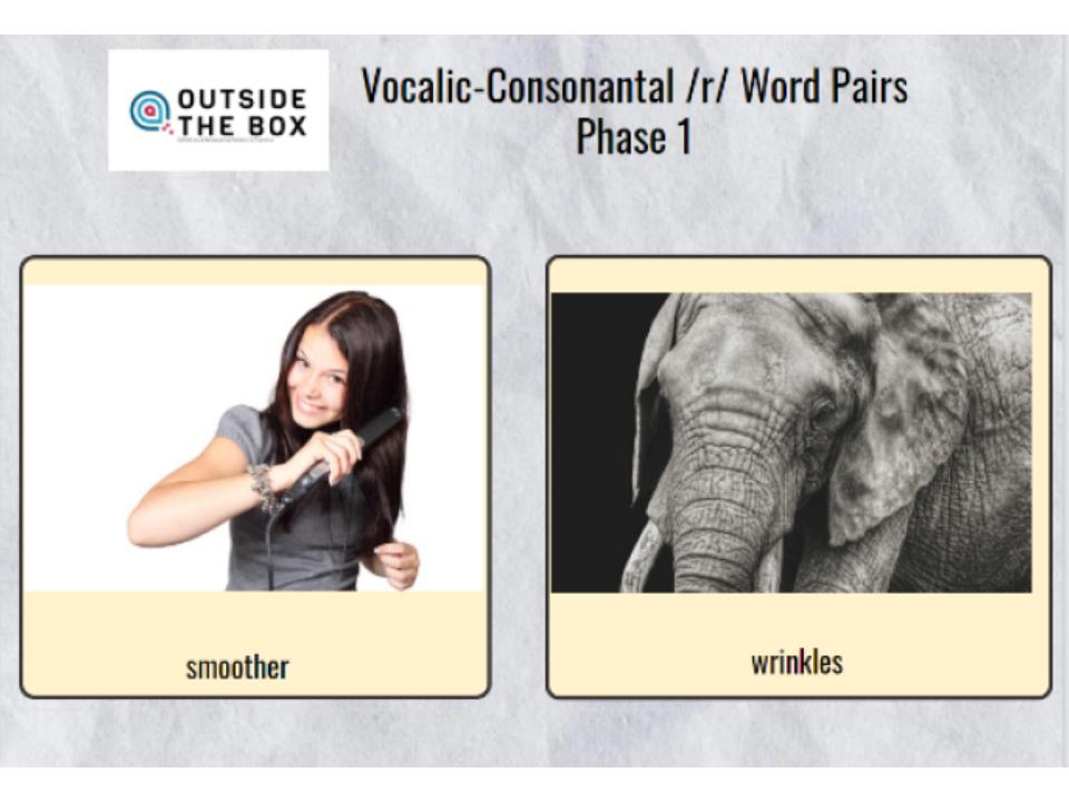 I’m proud to announce the creation and addition of this Phase 1 deck of word pairs for those clients/students who just can’t quite figure out the correct placement for vocalic /r/ but can correctly produce /r/ as a consonant syllable initially. There are 20 pairs where the first word ends in an r-controlled vowel (e.g., smoother) and the following word begins with consonantal /r/ (e.g., wrinkles). This deck helps students use co-articulation to learn the correct placement for vocalic -r by capitalizing on their ability to correctly produce consonantal /r/. Therefore, students should produce the word pairs as connected word pairs, not as individual words. Click here to access this deck on the OTB Boom Cards store.