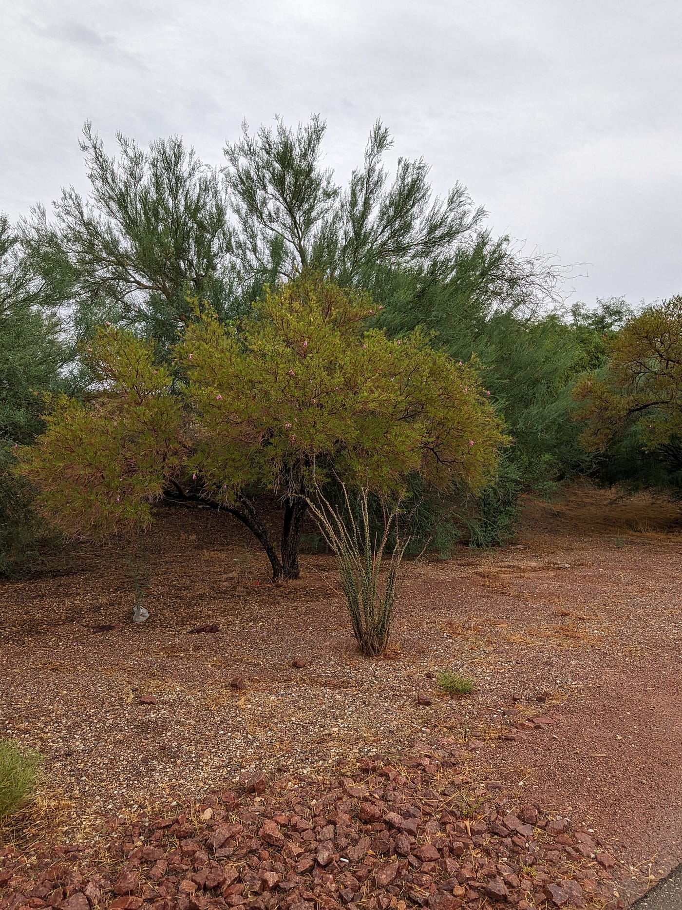 I don’t know the name of the smaller, thorn covered plant in the foreground. Behind it is another mesquite tree. Behind the mesquite tree is a palo verde tree. The palo verde trees around here have put out new leaves in the last couple of days. What is striking to me is the layers of greens and browns in the image.